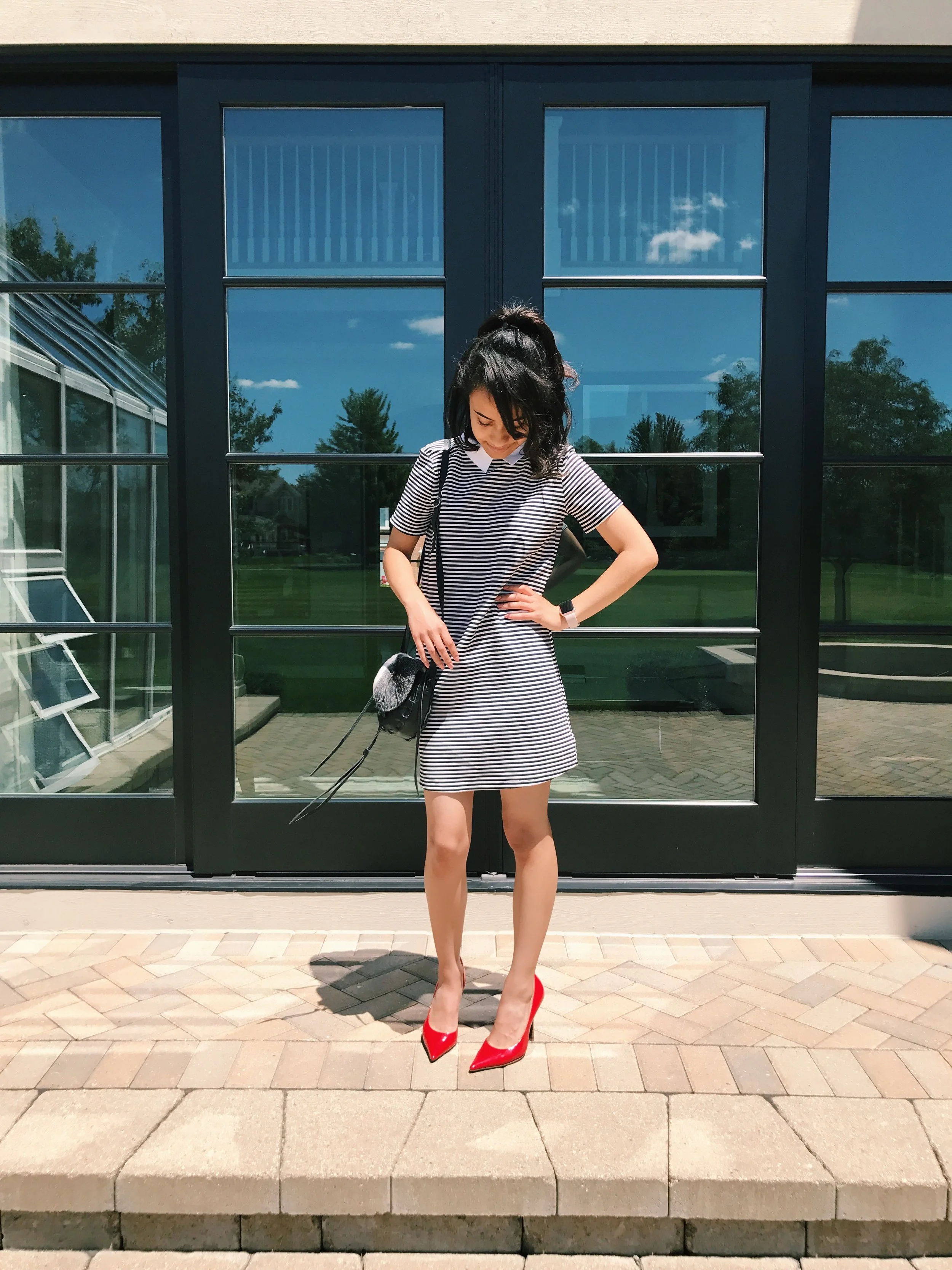 You may remember this dress from my Zara haul on YouTube. It is a black and white striped dress with a bright white collar attached. It is a cross between an a-line and shift dress. It's loose and really comfy to throw on.